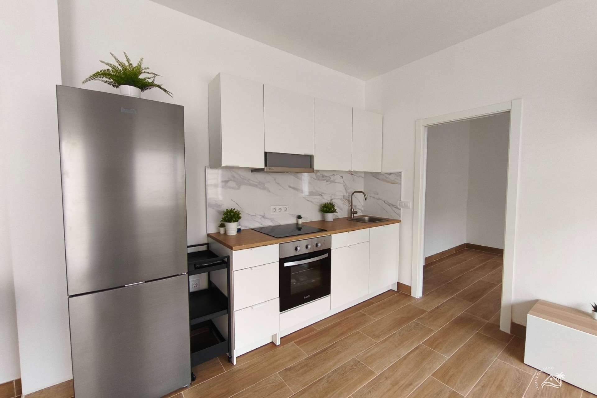 Die Wohnung verfügt über zwei Schlafzimmer und ein Badezimmer. Sie ist mit doppelt verglasten Fenstern mit Jalousien und einer Vorinstallation für eine Klimaanlage ausgestattet. Die voll ausgestattete Küche geht in den Wohn-/Essbereich über, der bereits mit Tisch, Stühlen und einem TV-Möbelstück möbliert ist.